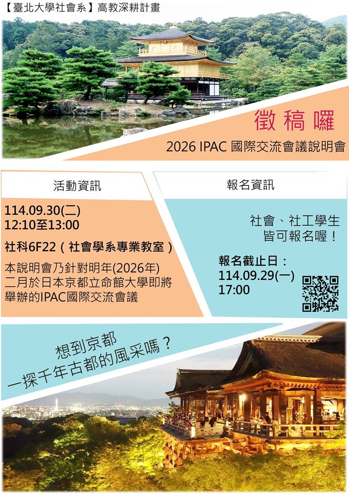 伴隨全球化影響,培養「國際觀」儼然成為現今重要的課題與準則。台北大學社會學系以「國際學術交流」作為主軸,將與日本立命館大學產業社會學系簽訂學術相關合作方案,並且與韓國中央大學社會學研究所三校輪流舉辦IPAC(International Postgraduate and Academic Conference)研討會。本說明會乃針對明年(2026年)二月於日本立命館大學即將舉辦的IPAC國際交流會議,並預計於10月進行徵稿活動。