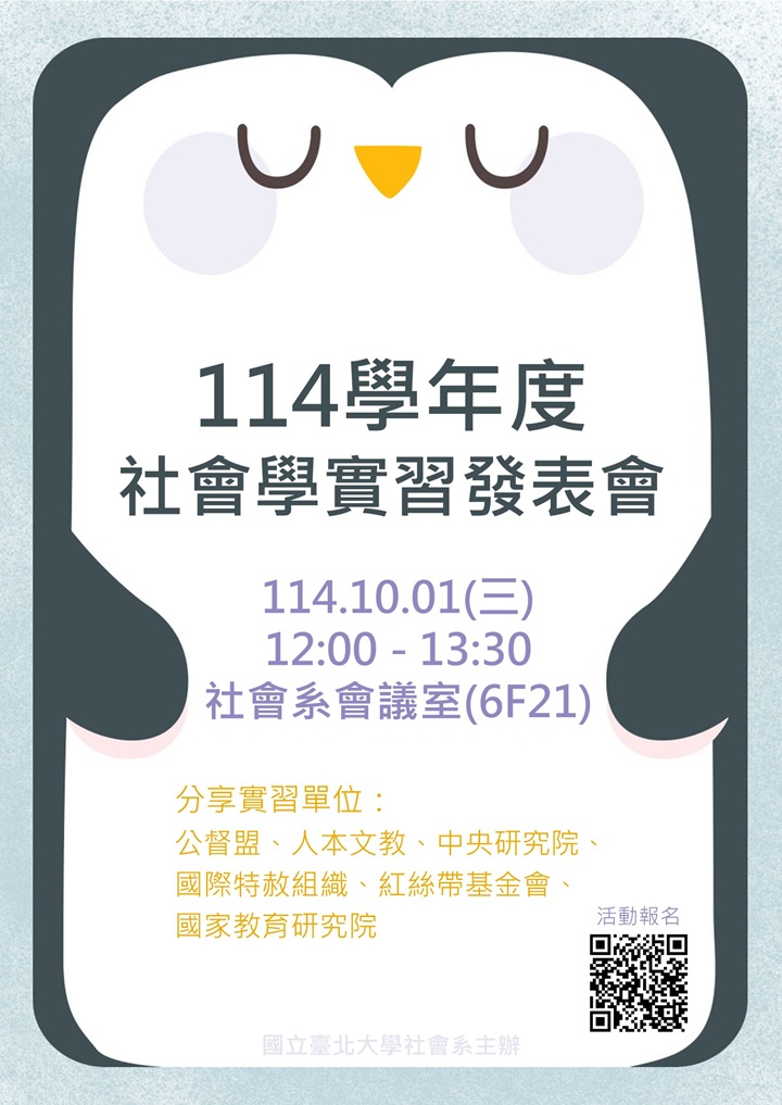 114學年度「社會學實習成果發表會」, 將於10/01(三)中午12點整, 於社會科學大樓6樓社會系6F21會議室準時登場。 歡迎大家來聽自己的同學、學長姐、學弟妹們, 分享他們暑假實習的甘苦談~ 未來對實習有興趣的同學,你更不可以錯過這次的分享! 當天附有中餐,請大家告訴大家~快點來報名吧!! 報名網址:https://forms.gle/sER9LsRgbMojA4GLA 活動時間:2025.10.01(三)12:00-13:30 活動地點:社科院6F21 報名截止:2025.09.30(二)12:00