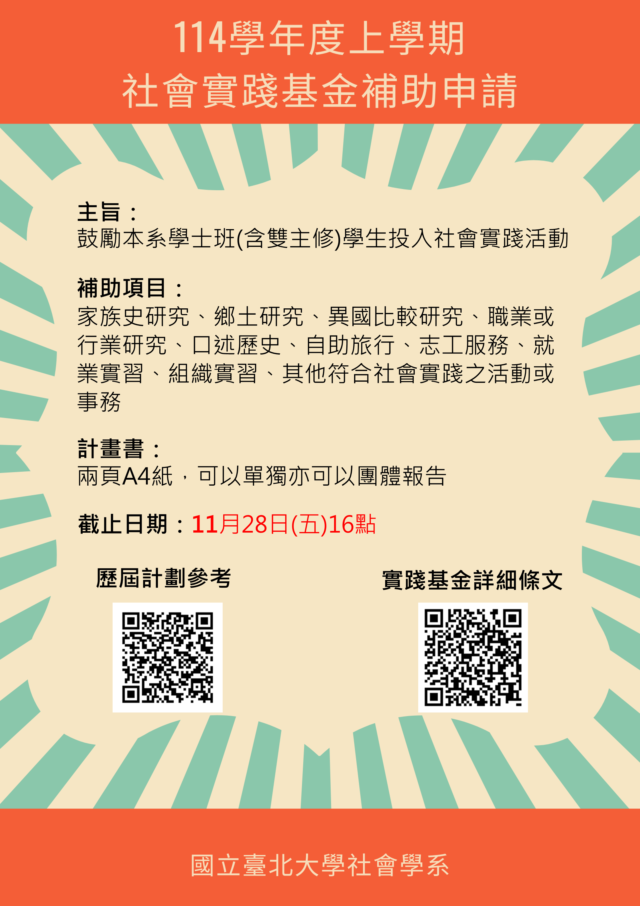 本學期社會實踐基金補助申請至11月28日(五)16點截止